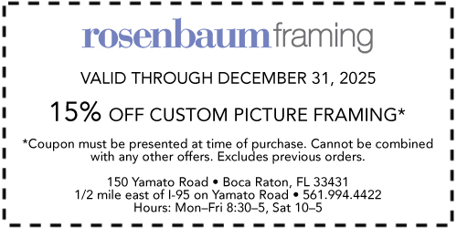 To receive 15% off your custom picture framing order, print and present this coupon at the time of purchase in our Boca Raton framing center.
